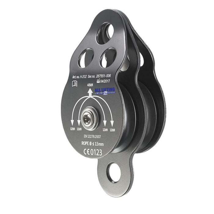 The castor double pulley is designed for use in complex block and tackle systems. With two pulleys and four attachment points. This smooth-rolling pulley works effectively to make rescue operations, rigging and rope access technology much easier. It is well suited to assembling a block and tackle, setting up auxiliary lines and redirecting rope.