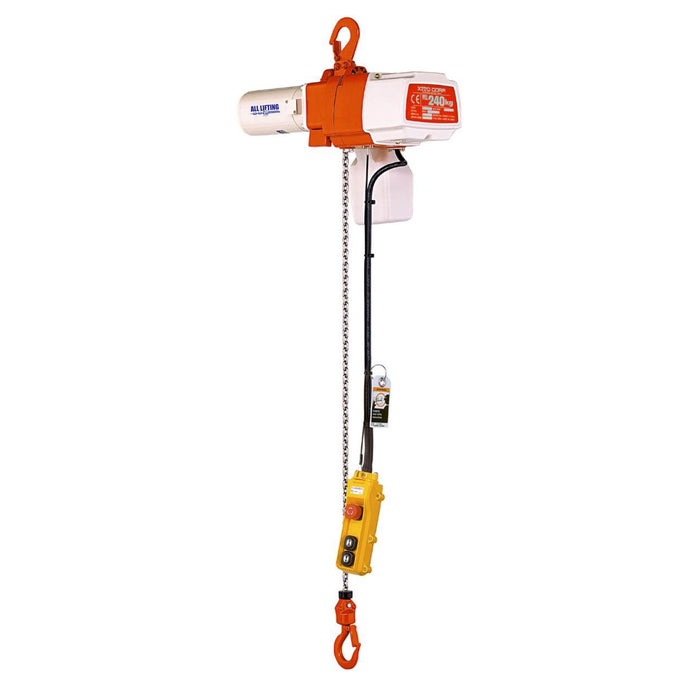 Elevate your lifting capabilities with the Electric Chain Hoist with Pendant Control. This powerful hoist, complies with AS 1418.2 and it is designed to make your lifting tasks a breeze. Whether you need single or dual speed, it's ideal for effortlessly handling small loads that are too heavy to manage manually. The EDL range of single-phase hoists stands out with their robust motors, complete with automatic load brakes and overload clutches. Housed within a lightweight, compact aluminum body with an IP54 rating, these hoists are built for durability and longevity. With a 30% ED rating, an innovative patented 'Friction Clutch' for reliable overload protection, an upper limit switch, and a high-performance mechanical brake, this hoist ensures safe and efficient lifting. The nickel-plated load chain adds an extra layer of rust and wear resistance, making it the perfect choice for your lifting needs.