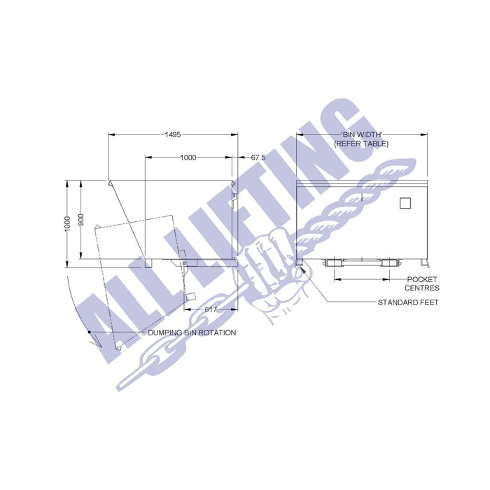 Operating Instructions: When transporting the bin to the discharge point, the forklift tines should be positioned fully under the bin to ulitise the forklift's maximum lift capacity. To tip the bin, the catch the bin on the edge of the bulk container and reverse the forklift. When the tines clear the pivot point, raising the bin will permit a complete discharge of contents.